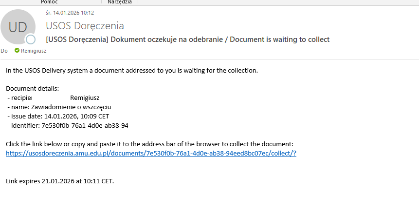 Security rules: Please remember that during the document retrieval process, we never ask for your USOS password via email or through links in messages.
